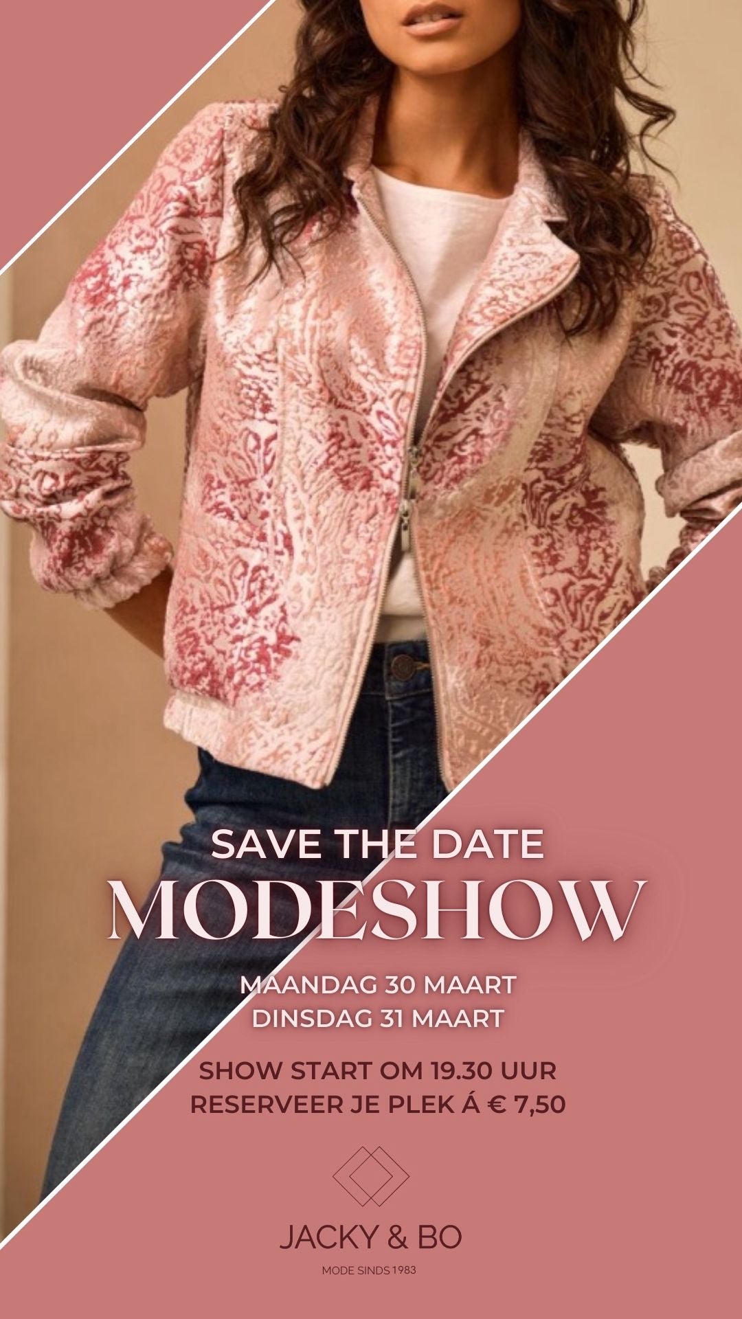 Entree is β¬7,50 per persoon. Reserveer je plek. Bel 0255 517494 of mail info@jacky-bo.nl en beleef samen met ons twee stijlvolle avonden vol mode en gezelligheid. We kijken ernaar uit je te zien!