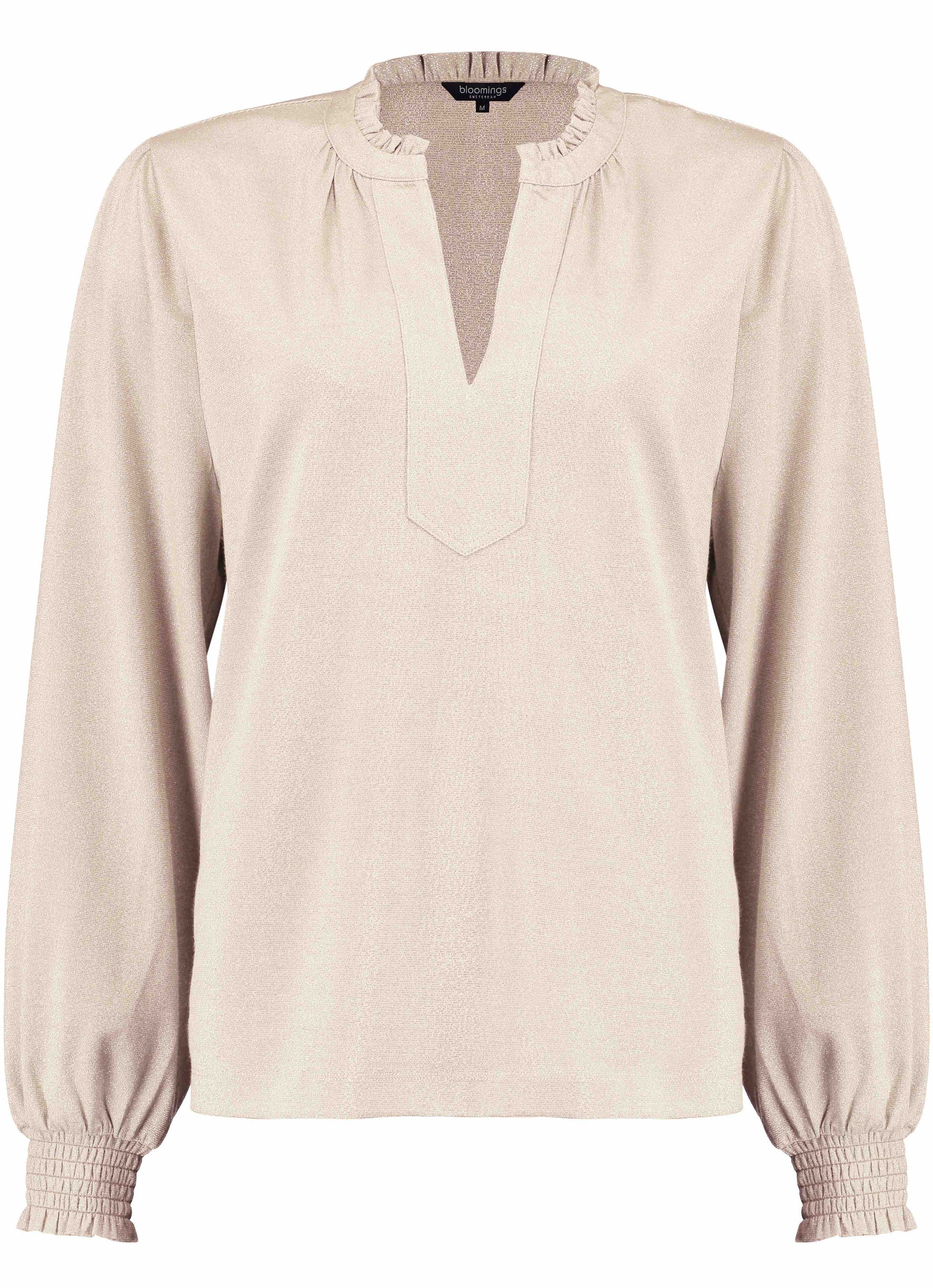 Deze elegante blouse combineert het comfort van jersey met een subtiele glans van lurex en vrouwelijke ruffle-details. De soepele stof voelt zacht aan op de huid en beweegt prettig mee. Dankzij de verfijnde afwerking is dit een item dat je zowel casual als feestelijk kunt dragen.