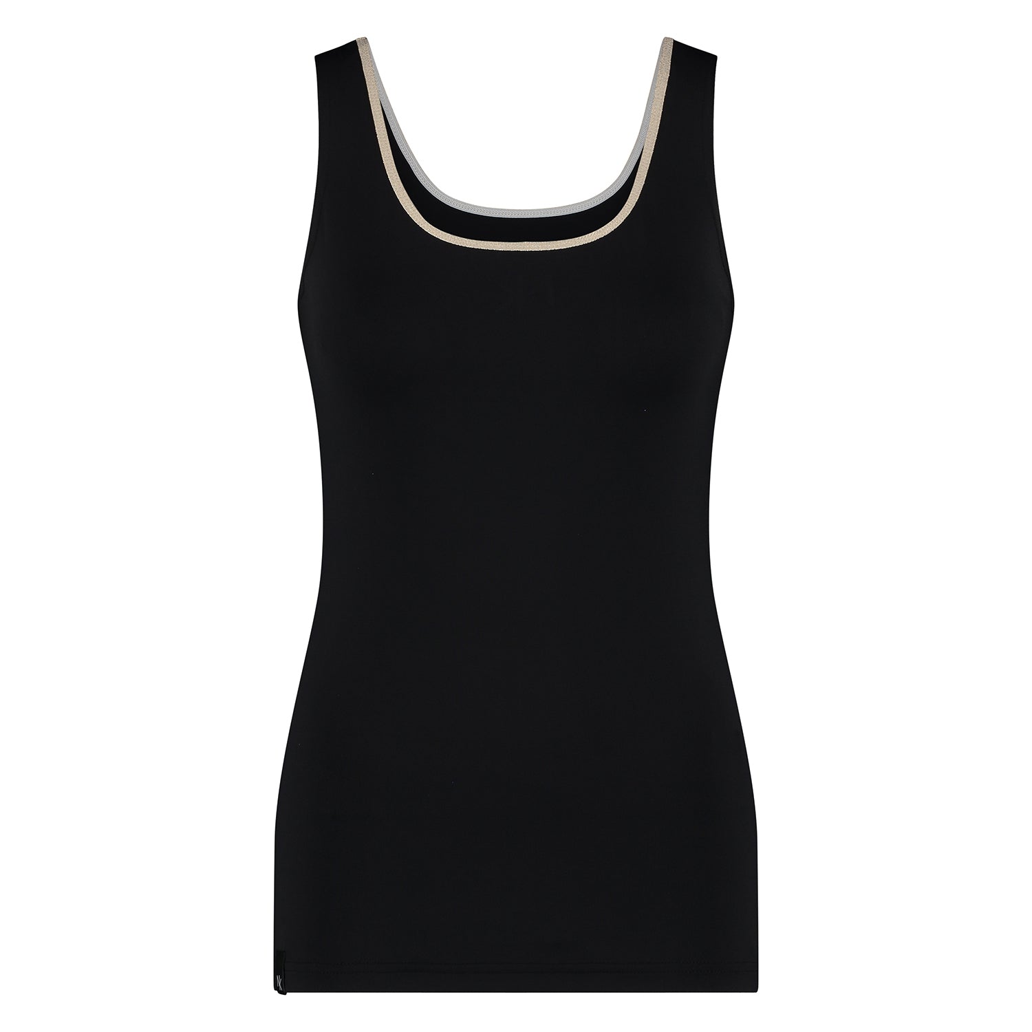 - Snit: aangesloten pasvorm, ronde hals, brede bandjes, subtiele gouden lurex rand